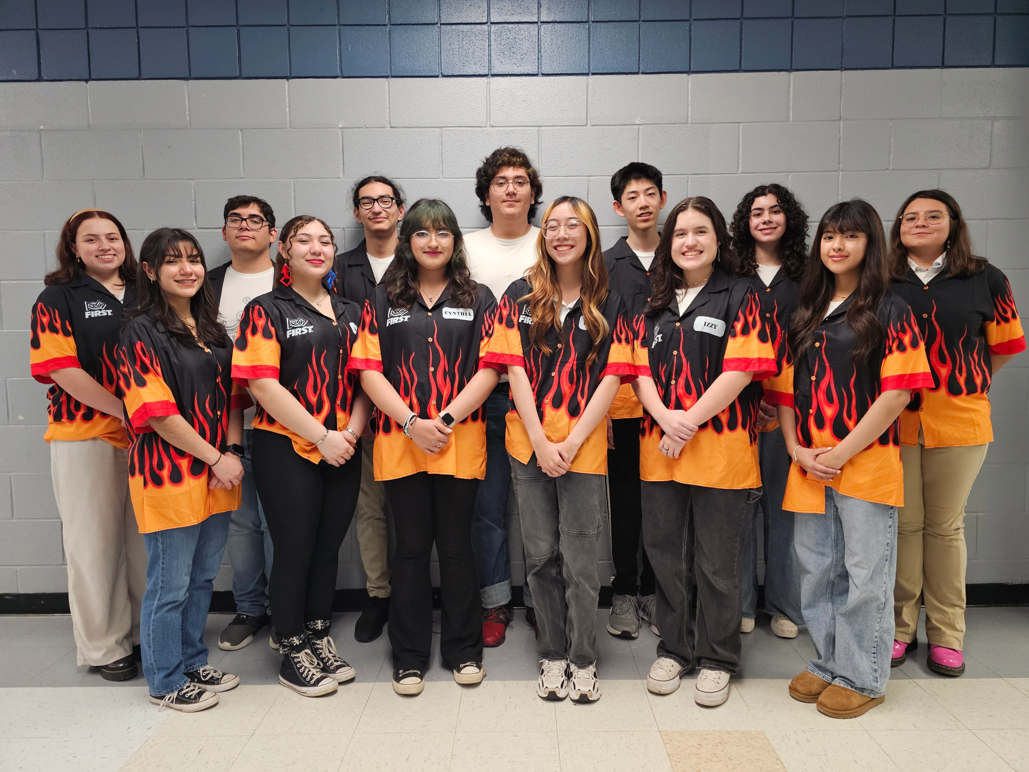 Farrell and Cristian driving their robot and hanging on the truss.